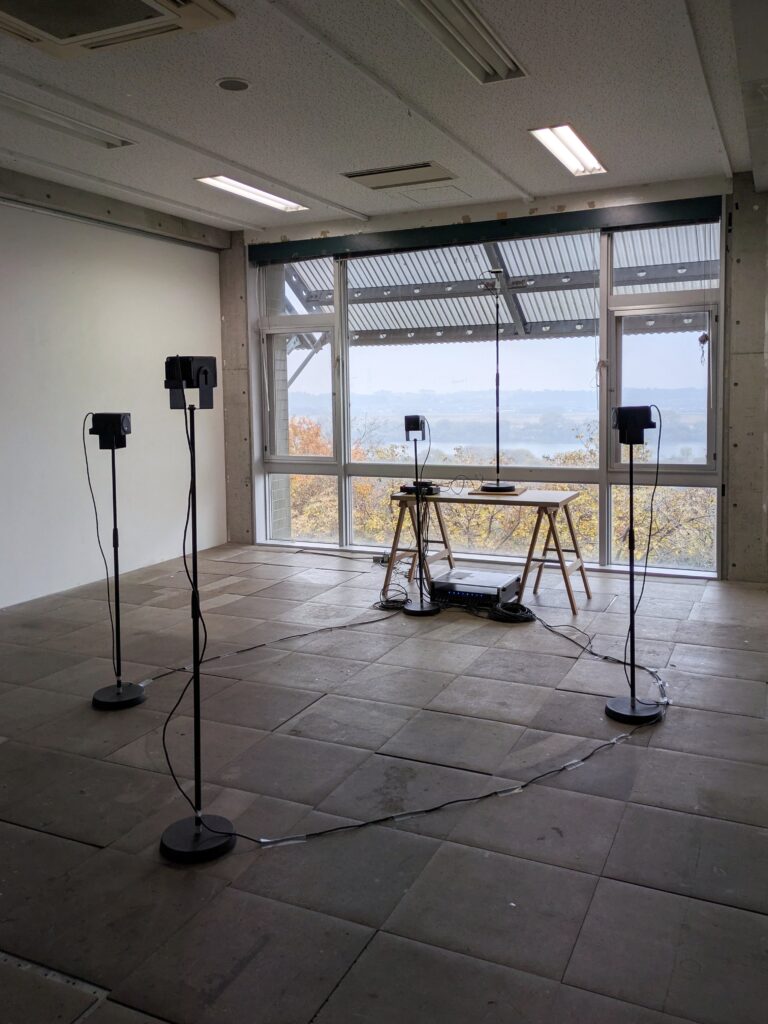 本作品は、深度センサーが捉える体験者の微細な動作を、音のフィードバックとして空間にあらわす。体験者が意識的に動けば、その輪郭が水の中の波紋のように残響する。そして静止し続ければ、自己意識の境界が曖昧になっていくように、徐々に音がひろがっていく。